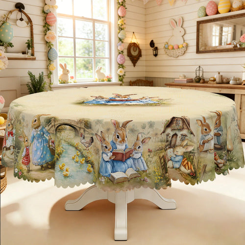 1 Easter-Themed Round Tablecloth, Available in 5 Sizes, Featuring a Central Cluster of Soft and Cute Rabbits Reading Books, with Little Rabbits Hopping Across the Bridge, Snuggling in a Hut, or Holding Bread, Embossed Edges,